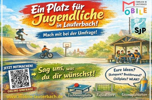 Lauterbach braucht einen Ort für Jugendliche. Einen Platz, an dem Ihr Euch treffen, bewegen, ausprobieren und einfach Zeit miteinander verbringen könnt. Einen Ort, der zu Euch passt. Gemeinsam mit dem Stadtjugendparlament starten wir als MOBILE e.V. deshalb die Online-Umfrage „Ein Platz für Jugendliche in Lauterbach“. Zur Auswahl stehen unter anderem: Unter „Sonstiges“ könnt Ihr natürlich auch eigene Ideen einbringen. Euer Platz soll zu Euch passen – also sagt uns, was Euch wirklich wichtig ist. In den Lauterbacher Schulen werden aktuell Flyer mit einem QR-Code verteilt, der direkt zur Umfrage führt. Mitmachen dauert nur eine Minuten, hat aber große Wirkung. Ein Jugendplatz fehlt in Lauterbach schon lange. Das Thema steht inzwischen…