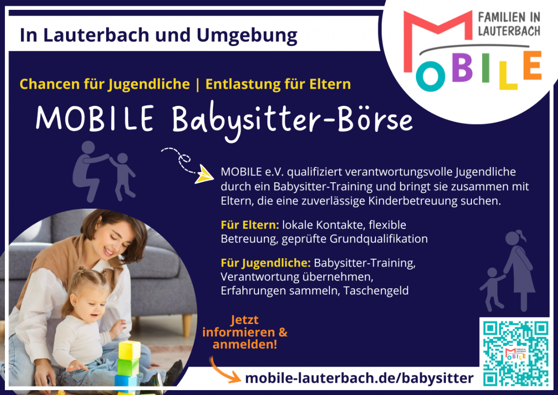 MOBILE e.V. qualifiziert verantwortungsvolle Jugendliche durch ein Babysitter-Training und bringt sie zusammen mit Eltern, die eine zuverlässige Kinderbetreuung suchen. Unser Ziel ist einfach: Entlastung für Eltern und Chancen für Jugendliche. Eltern profitieren von flexibler Betreuung durch engagierte Jugendliche aus der Region, die eine geprüfte Grundqualifikation mitbringen. Diese wiederum können sich ein Taschengeld verdienen, Verantwortung übernehmen und wertvolle Erfahrungen sammeln.