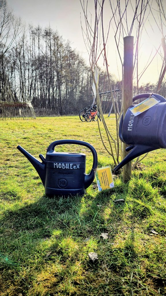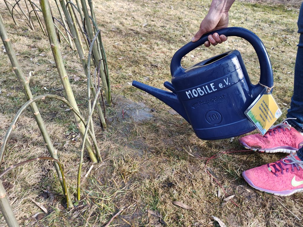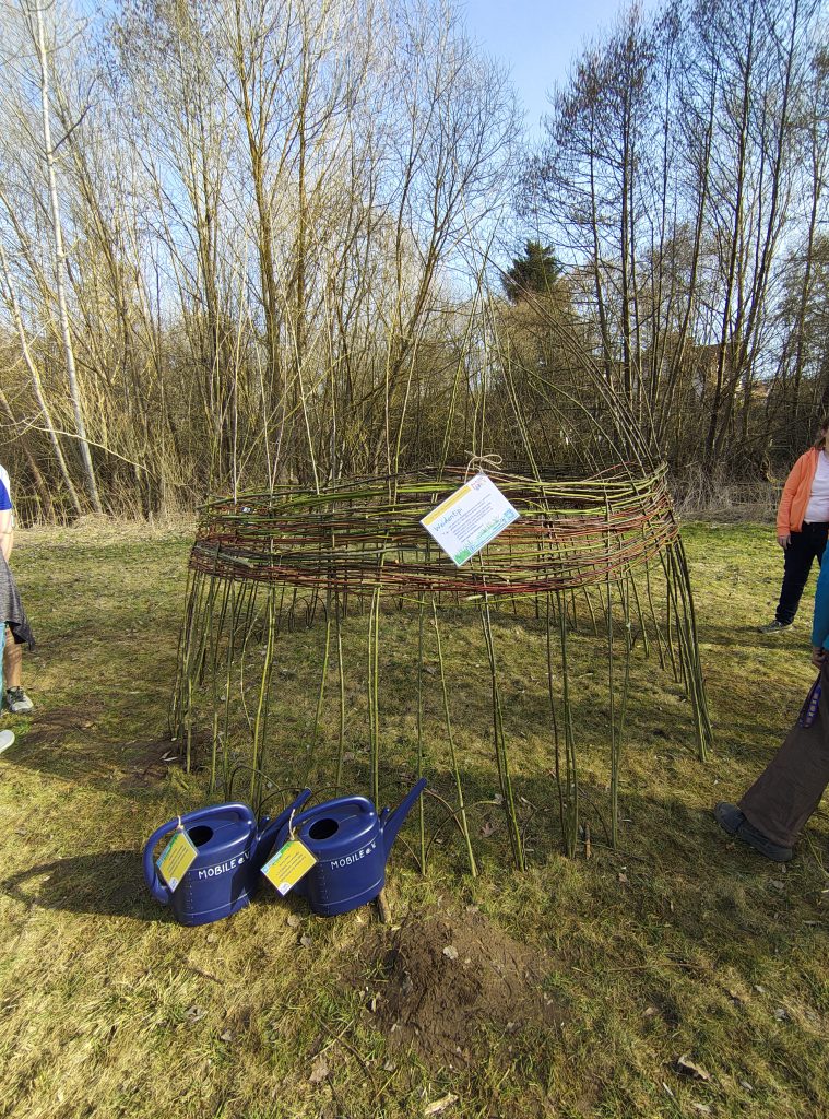Jetzt darf das neue Abenteuerversteck weiter wachsen. Damit es gut anwächst, braucht es regelmäßig Wasser. Wer also am Spielplatz vorbeikommt: Gießt gerne mit! Zwei Gießkannen stehen am Spielplatz bereit – Wasser gibt es direkt in der Lauter.