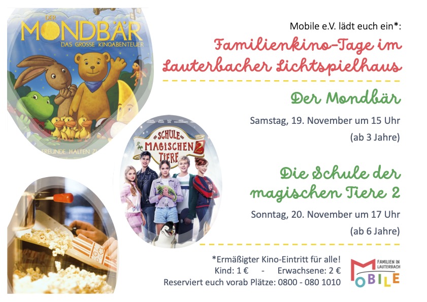Ist November nicht der perfekte Kino-Monat? Wir finden: Ja! Darum lädt Mobile e.V. euch und eure Kinder ins Lauterbacher Lichtspielhaus ein. Wir haben euch zwei unterhaltsame Filme ausgesucht, einer für die Kindergartenkinder, einer für die Größeren! Und das beste: Ihr zahlt an den zwei Tagen nur einen symbolischen Eintrittspreis von 1 Euro (Kind) bzw. 2 Euro (Erwachsener). Wir empfehlen euch eine telefonische Reservierung.