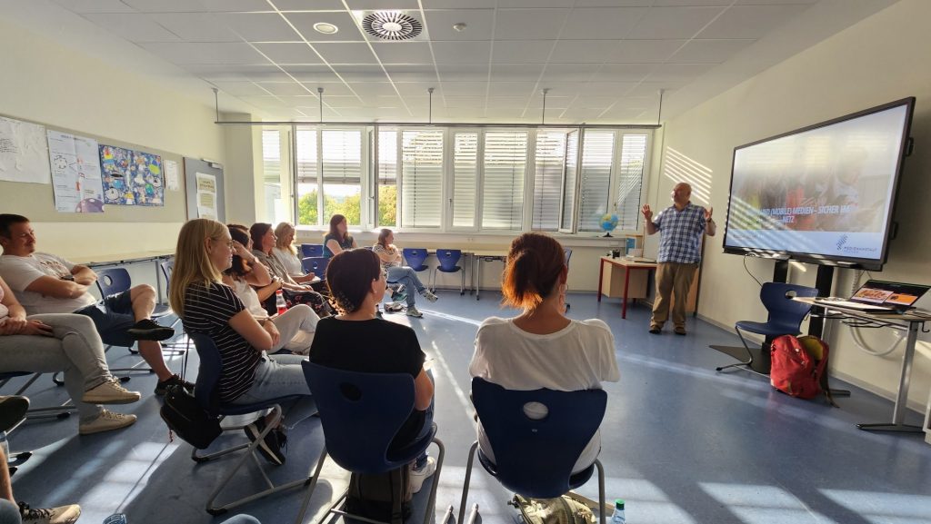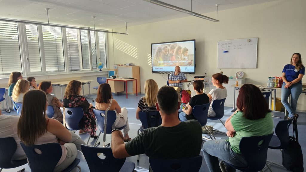 Am Abend schloss die Infoveranstaltung für Eltern den Aktionstag ab. In einem rund zweistündigen Vortrag vermittelte der Referent von Blickwechsel e.V. einen fundierten Überblick über aktuelle Plattformen, Trends und Herausforderungen im digitalen Alltag von Kindern und Jugendlichen. Themen wie Datenschutz, problematische Inhalte sowie die Frage, wie Eltern ihre Kinder sinnvoll begleiten können, standen im Mittelpunkt. Dabei wurde deutlich: Verbote allein helfen nicht – vielmehr geht es um Aufklärung, Vertrauen, klare Regeln und eine offene Kommunikation innerhalb der Familie.